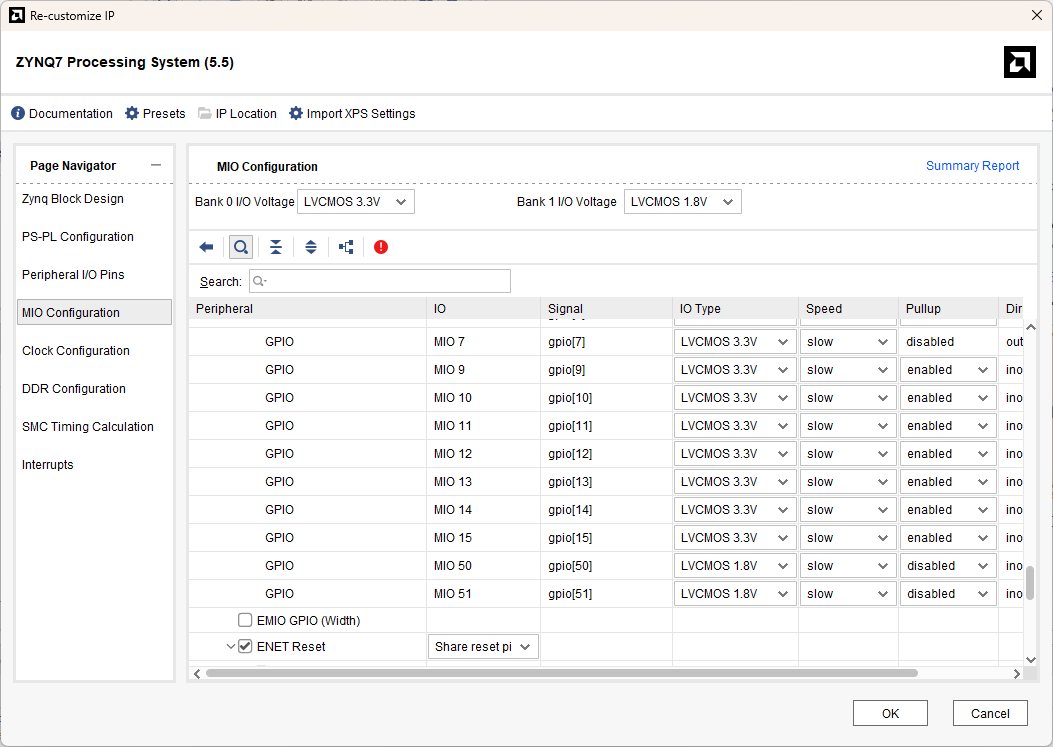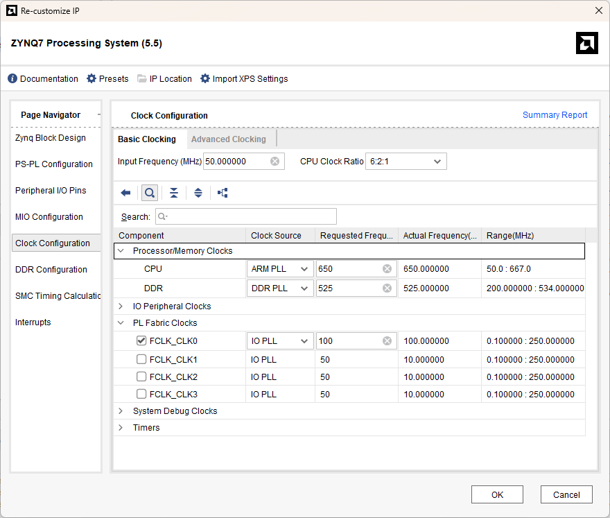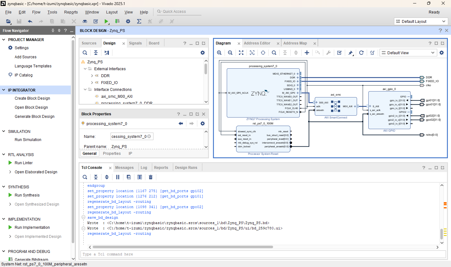 - Zynq Processing System を置く。[Run Block Automation]を実行する。(FCL_CLKOの設定は不要。MIO50,51は要確認。)