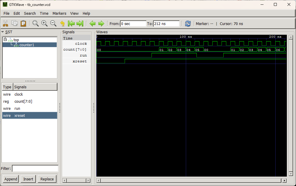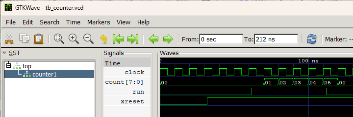 # シミュレーションを実行する。結果は波形ファイル tb_counter.vcd に保存される。
