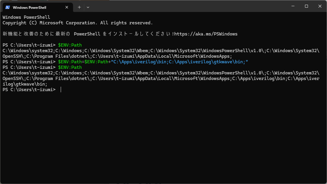 $ENV:Path=$ENV:Path+";C:\Apps\iverilog\bin;C:\Apps\iverilog\gtkwave\bin"