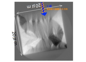 磁化した試料の吸収スペクトルを円偏光を使って測定すると、 円偏光のスピンと磁化が平行な時と反平行なときでスペクトルが異なります。 XMCDを用いてPEEM像を得ることの利点としては、磁区構造を目で見て観察することができ、 これにより微小パターンの磁化方向の決定や磁区(スピンの向きが同じ方向を向いている領域) の決定を行うことができます。 またスピンや磁化方向を変化させることにより磁性変化の観察を行うことができます。 上図のように実際の観察では、 円偏光のスピンと試料の磁化方向が平行な部分は多くの光電子を出すことでPEEM像では白く写り、 反平行な部分は比較的少ない光電子を出すことでPEEM像では黒く写ります。 また、垂直な部分はその中間でグレーに写ります。