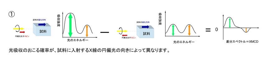 X線磁気円二色性(X-ray Magnetic Circular Dichroism XMCD)とはX線吸収分光を応用したもので、 磁性体試料に円偏光させたX線を照射したとき、吸収スペクトルが試料の磁化方向と円偏光の光スピンの方向に依存して異なる現象のことをいいます。 この現象を利用して実験を行うことで、磁性体の研究を行うことができます。