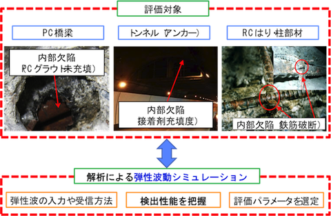 弾性波法は,コンクリートの品質や内部欠陥の評価など,適用範囲が広いことから,特に実構造物での調査において活躍が期待されています。しかしながら,実際の現場においては,対象とする実構造物の条件(形状・材質など)や評価対象(ひび割れや空隙など)ごとに,弾性波法における測定条件を適切に設定しないと適確な評価を行うことができず,非破壊評価結果と削孔などにより調査した実態が一致しないケースがあります。このような背景から,コンクリート構造物の内部欠陥を効率よく適確に評価するため,対象構造物での計測を実施する前に弾性波動シミュレーション解析を行い,コンクリート中での弾性波の伝搬挙動を把握した上で,予め,対象とする構造物および内部欠陥に応じた「評価に適した弾性波の入力や受信の条件(計測条件)を決定」,「評価パラメータを選定」および「検出性能(適用範囲)」を把握した後に計測に移行する形の「解析を援用した弾性波法」に関する研究を行っております。