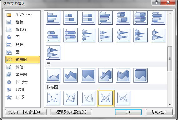 次に「挿入」リボンの「グラフ」メニューの右下隅「グラフの作成」をクリックする(図−5).するとグラフの挿入というウィンドウが出てくるので,左側のウィンドウから散布図を選択,右側のウィンドウでは右から2番めのものを選ぶ(図−6).これはデータを直線で結ぶ散布図になる.