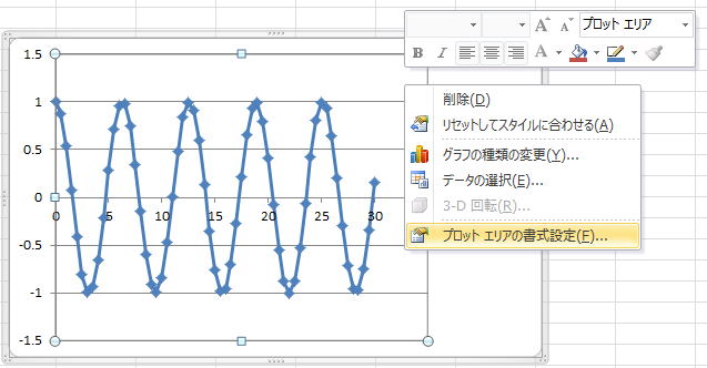 グラフ中の凡例などは選択した後,DELキーを押すことによって消去したり,ドラッグすることによって移動することができる.また,右クリックで現れるメニューから色々編集できるので各自試して欲しい(図−11,12).例ではグラフの「プロットエリアの書式設定」を選択し,領域の色を変更する画面である.