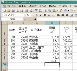 このような単純な四則演算だけだと,単に非常に高価な電卓に過ぎない.ここからほんとにほんとに計算計算,すごい計算が始まる.既に入力されてあるデータを組み合わせて思ったとおりに計算させてみよう(計算するのは,不平を言わないコンピュータ.ただし,文句(エラーメッセージ)は言うかもしれない).例えば,いま見ているマイデータ(ふるさと都道府県の自治体のデータ)の中の「面積」データの合計を計算してみよう.まず,「面積」の列(上に並んだ列記号の中の「D」列)の下の方の適当な空白セルをクリックしてアクティブ(入力可能状態)にする.「画面いっぱいで空白なんか無い」というときは,右側のスライドバー(縦方向)をドラッグして空白セルをみつけよう.この空白セルに「面積」の合計を計算して表示させるには,上に並んでいる「面積の列(D列)」のセルの数値をどんどん足していけばいい.セルに表示されている数字を改めて全部打ちこむ?,そんなことはない,それなら電卓使ったほうがまし.ここでは,「セルごと」どんどん足していこう.まず半角文字で「=」を入れてから数字の代わりに足したい数値が入っている「セル」をクリック. 例えば,「=」の後に「面積の列(D列)」の2行目のセルをクリックすると,セル内容表示は「=D2」になる.続けて,「+」を入力してD列3行目のセルをクリックすると,セル内容表示は「=D2+D3」に.さらに,「+」を入力してD列4行目のセルをクリックすると,セル内容表示は「=D2+D3+D4」に.こうやって,「+」を間にはさみながら足したいセルを全部クリックしていって,「セルごと足し算」の数式が完成したら,Enterキーを押す.おめでとう.面積の総和がセルに表示されました.