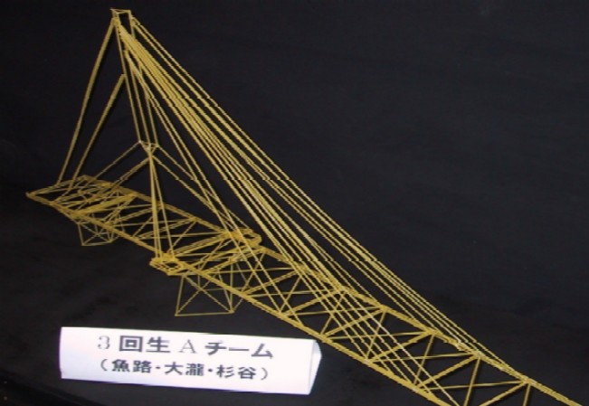構造特性:非常にオーソドックスな橋梁で、無理が少ないところが評価される。欠点としては、斜張橋なので桁を変断面にする必要がないこと、スパンのわりに橋脚が高いことが挙げられる。実現性という面から見ると、張り出し部分からタワーを設置するのは困難であるが、模型としては非常によくできている。曲線部材に鉄筋をまっすぐ入れるといった変な発言がなければ、ダントツで優勝したであろう。
