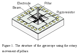 We designed a piezoresistive micro gyroscope using the rotary movement of pillars. The design of the micro gyroscope is based on the Coriolis effect. The structure of the micro gyroscope is shown in Figure 1. The micro gyroscope consists of a cross-shaped and folded silicon beam with p-type Si piezoresistors, and pillars at the center and both sides of the beam. The cross-shaped and folded silicon beam is 50 mm - wide and 50 mm- thick. These piezoresistors are formed at the locations where the maximum compressive and tensile stresses are applied.