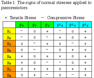The micro gyroscope uses the rotary movement of pillars induced by the four electromagnetic actuators. When the angular rate is applied to the micro gyroscope, the Coriolis force changes the stress in the beam. The micro gyroscope detects the change of stress in the beam via the piezoresistors. The Coriolis force FC and inertial force Fa that were applied to the pillar by the angular rate and acceleration are shown in Figure 2. The influence of acceleration can be removed by the combination of the configuration of both side pillars in Figure 1 and the bridge circuit. As can be seen from Figure 3 and Table 1. When the inertial force Fx is applied to the micro gyroscope, output voltage of the bridge is zero due to the same sign of the pairs of (R1, R2) and (R5, R6). On the other hand, when the Coriolis force FCx is applied to it, output voltage can be obtained due to the different sign of the pairs. The pairs of (R3, R4) and (R7, R8) are same idea as the pairs of (R1, R2) and (R5, R6) on this point.