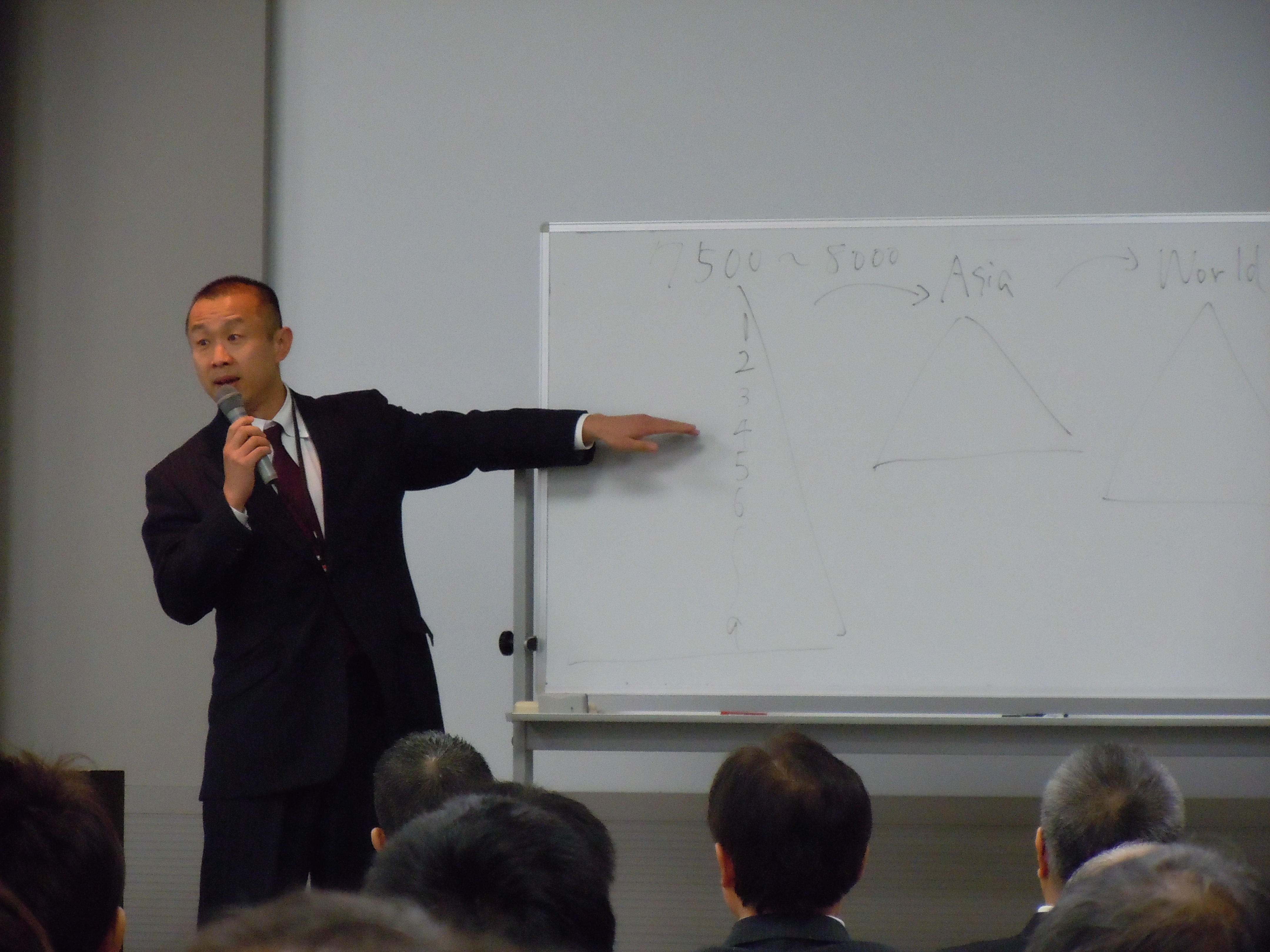 まず、特別講演として「bjリーグと地域密着プロスポーツクラブ成功」と題して、日本プロバスケットボールリーグ取締役会長の池田弘さんがbjリーグ設立の経緯やシングルエンティティ(単一事業体)として、リーグ経営の安定化を図るために、バスケットボールというスポーツそのものを普及させるためのカップ戦の開催やバスケットボールクリニックといったアカデミー事業にbjリーグは、力を注いでいるということでした。