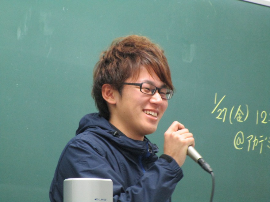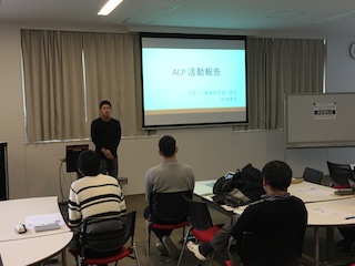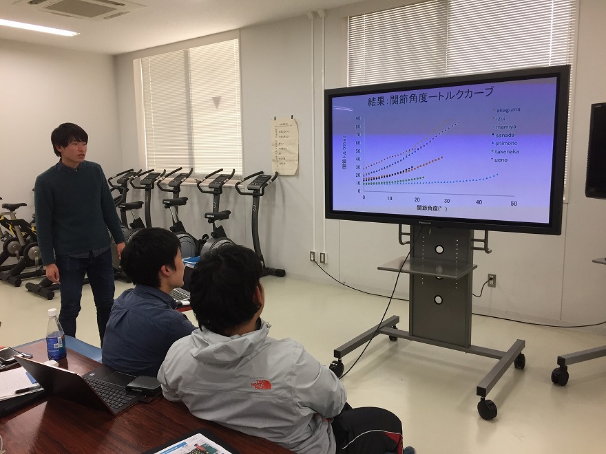 この日は、後期のすべての指導補助が終了し、その学びを報告する会が開かれました。今学期の受講生の2名(松浦拓也さん、松本秀光さん)は、指導案の書き方から、指導中の声のかけ方、安全への配慮等のそれぞれの視点からの学びを、実際に用いた資料や写真等を交えて、非常に丁寧でわかりやすい報告をしてくれました。