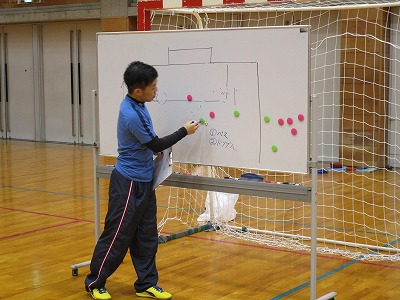 スポ健3回生の(教)保健体育科授業演習でも、受講生が頑張って体育指導に取り組んでいます。今週は「球技領域:ゴール型(サッカー)」の指導が行われました。球技では、「ボールを持っている者」と「ボールを持っていない者」を分けて動きを指導する事とされていますが、今回の授業では、「空いた空間に走り込む」動きを理解する事を目標として授業が展開され、ボールを持っていない者が空いた空間に走り込み、その動きを予測して正確にパスをする練習を行いました。