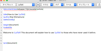 みなさん、こんにちは、嶋村です。さて今日から LaTeX 講座ですが、1回目の今日はとりあえず簡単な文章を書くことを目指します。準備(ダウンロード・インストール)出来ましたね?あとこのブログは Mac ユーザーしか想定してませんのでウインドウズへのインストールはご自分で調べてください。(笑) インストールしたら LaTeX の使い方自体は同じです。