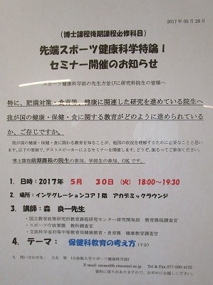 立命館大学スポーツ健康科学部では、様々な形で地域貢献を行っています。私は「教育学コース」の教員ですし、元中学校の体育教師ですので、学校の体育授業研修に講師として招かれる事があります。先週火曜日に大阪府茨木市の中学校体育授業研修会に招かれ、体育の公開授業を参観し、その後研究協議で講評をさせて頂きました。多くの小中学校の先生方が見守るなか、中学3年生の「陸上競技」の授業でしたが、若くて元気な先生で、体育授業に懸命に取り組んでいる姿に好感が持てました。また、生徒達も先生の指導に対して信頼感を持っているのでしょう、元気いっぱい熱心に学習課題に取り組んでいました。
