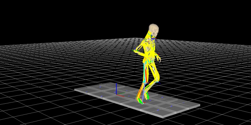 ですがこれらの手法では同時計測できる筋の数も限られますし、計測器を装着すること自体が動作の外乱になったりします。そのため運動中の筋活動の様子を考察する目的で、筋骨格シミュレーションの手法が用いられるようになりました。筋骨格シミュレーションではモーションキャプチャーのデータ等を入力として、関節で発揮されるトルクを計算し、更に各々の筋が発生する張力を推定することが可能です。つまりスポーツ等の動作から、どの時点でどの筋がどれくらい力発揮をしていたか、を知ることができるのです。
