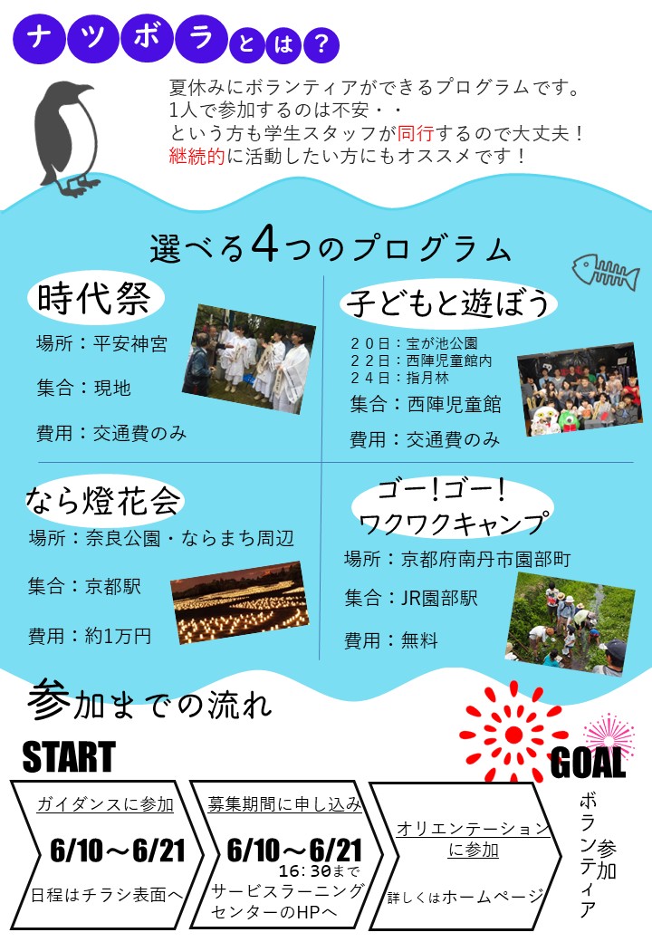 夏休みにボランティア活動ができるプログラムです。今年は4つのプログラムがあり、その中から自分の興味・関心あるボランティア活動を選ぶことができます。活動場所は主に京都府内です。(一部奈良県内のプログラムあり)