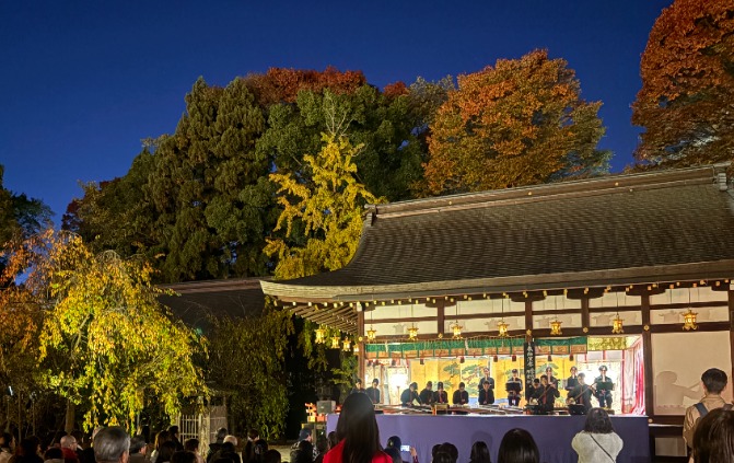 昨年、衣笠キャンパス地域連携課を通じた北野天満宮からの依頼を受けて始まり、今年は北野天満宮と邦楽部の双方が年間行事として位置づけるような取り組みとなっています。 美しい音色に参拝客が誘われ、客席は満席となり、立ち見の観客もいる中、全6曲を演奏し、聴衆を魅了しました。 ライトアップされた紅葉に囲まれ、揺らめくかがり火に照らされる中、和楽器の音色が境内に響き渡り、とても幻想的な空間でした。
