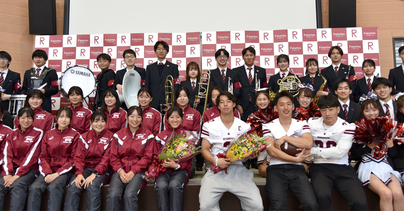 12月10日、びわこ・くさつキャンパスにて、アメリカンフットボール部(甲子園ボウル出場)および女子陸上競技部(富士山女子駅伝出場)の壮行会を開催しました。当日は約200名の学生・教職員が集まり、応援団による力強いパフォーマンスも披露され、会場は大いに盛り上がりました。