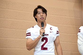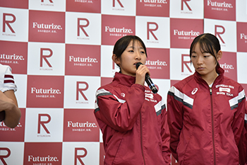 アメリカンフットボール部の今田甚太郎主将は、ライバルである関西学院大学と甲子園ボウルで戦うことへの強い意気込みを語りました。女子陸上競技部の土屋舞琴主将も、富士山女子駅伝での連覇に向けた力強い決意を述べました。