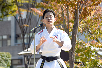 2025年11月に東京で開催される「第25回夏季デフリンピック競技大会 東京2025」に出場する、立命館大学体育会空手道部(新生)の森健司選手(産業社会学部3回生)の壮行会が、10月29日(水)に衣笠キャンパス東側広場で開催されました。