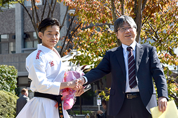 式典では、産業社会学部の黒田学部長をはじめ、関係者からの激励の言葉に続き、森選手による空手の演武が披露されました。力強くも美しい演武に、会場からは大きな拍手が送られました。その後、応援団と学生代表による応援ステージも行われ、森選手の健闘を願う声が東側広場いっぱいに響き渡りました。