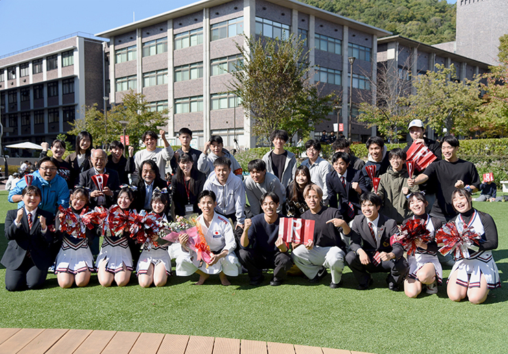 この壮行会は、立命館大学体育会本部が主催し、学生自身の手で企画・運営が行われました。当日は、昼休みの時間帯にも関わらず、約250人の学生・教職員が集まり、森選手のこれまでの努力と挑戦を称えました。会場には、学生スタッフによる司会進行や、応援団による迫力あるエールなど、多くの学生が力を合わせてつくり上げた温かな空気が広がりました。