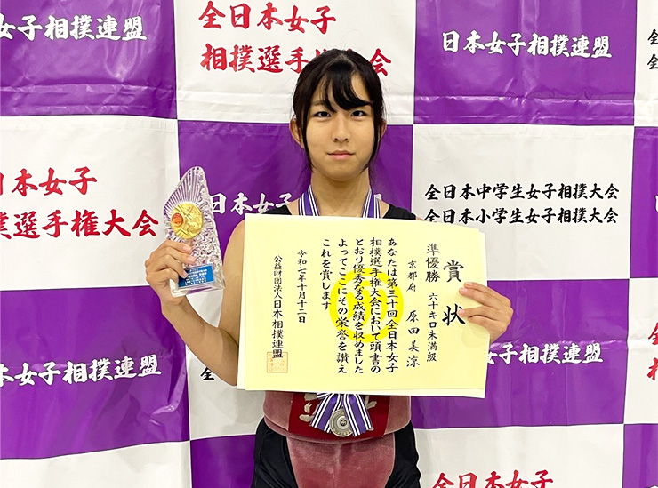 10月12日(日)、京都市武道センター体育館で開催された「第30回全日本女子相撲選手権大会」の個人戦に出場した原田美涼選手(経営学部1回生)が、60キロ未満級で準優勝に輝きました。
