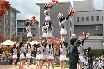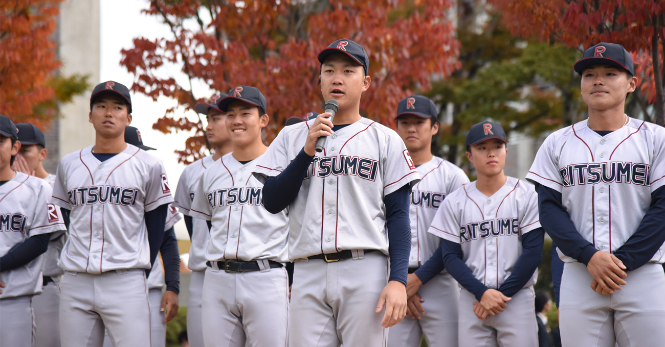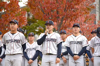 硬式野球部が、11月14日から開催される第56回明治神宮野球大会(大学の部)に10年ぶりに出場することを受け、11月11日(火)、衣笠キャンパス東側広場で応援壮行会が行われました。主催は立命館大学体育会本部で、応援団の協力のもと、会場には多くの学生・教職員が集まり、選手たちを激励しました。