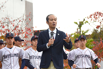壮行会では、上田憲嗣学生部長(スポーツ振興担当)が登壇し、「立命館創立125周年の節目に、硬式野球部が全国の舞台に挑むことを大変うれしく思います。努力を積み重ねてつかんだこの機会を胸に、立命館らしい粘り強い戦いを期待しています。」と激励の言葉を送りました。
