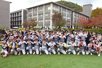 硬式野球部からは、副将の加藤優翔選手(産業社会学部4回生)と角井翔一朗選手(産業社会学部4回生)が力強く大会への決意を述べました。会場には、関西学生野球連盟秋季リーグ戦で活躍した遠藤投手、有馬投手をはじめ、多くの部員が参加し、晴れの舞台に向けて士気を高めました。