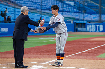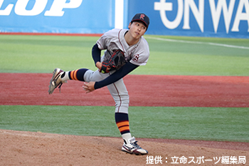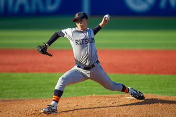 14日(金)、東京農業大学オホーツクとの初戦では、投手陣が圧倒的な存在感を示しました。先発の遠藤翔海投手(産業社会学部4回生)が5回無失点と安定した投球を見せ、6回から登板した有馬伽久投手(産業社会学部3回生)は圧巻の投球を見せ10者連続三振の大会新記録を樹立しました。打線も序盤から着実に得点を重ね、4–0の完封勝利で好スタートを切りました。