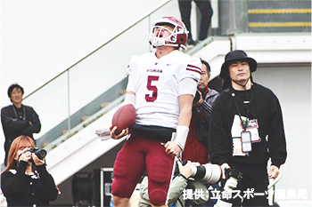第2クォーター、早稲田大学にフィールドゴールで3点を返され14-3。試合の流れが早稲田大学に傾きかけたところ、副将の木下亮介選手(経営学部4回生)が流れを取り戻す鮮やかなロングパスを決めてタッチダウン。ただ、早稲田大学も前半終了間際にタッチダウンを返し、前半は21-10で折り返しました。
