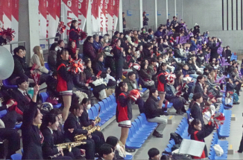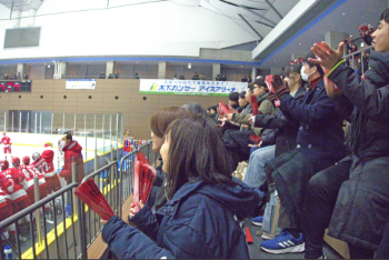 試合には両校の応援団が来場し、氷上のプレーに合わせた力強い応援が展開されました。学生や教職員を中心に約500名の観客が詰めかけ、会場は終始、熱気と一体感に包まれました。氷上の攻防とスタンドの声援が呼応し、開幕戦にふさわしい雰囲気が醸成されました。