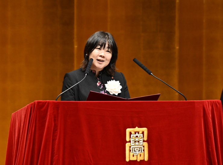 式典では、小川副総長から祝辞が述べられました。小川副総長は、「課外自主活動は、スポーツや文化、芸術、社会貢献など多様な活動を通じて学生が主体的に学び、人間的成長を遂げる本学の学びを体現するものです」と述べました。そのうえで、「今回の受賞を新たな自信として、立命館で培った学びと挑戦する姿勢を胸に、それぞれの目標に向かって歩み続けてほしい」と受賞者へ期待を寄せました。