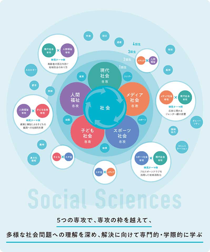 産業社会学部では、現代社会専攻・メディア社会専攻・スポーツ社会専攻・子ども社会専攻・人間福祉専攻の5つの専攻が、多様で複雑な今日の社会問題に対し、専攻の専門能力を高めながら、関心に応じて他専攻の科目も学べる柔軟なカリキュラム構成になっています。「クロスオーバー・ラーニング」とは、専攻の枠を超えたフレキシブルな学びのシステムによって、現代社会の課題を多面的に捉える力を養うことを言います。