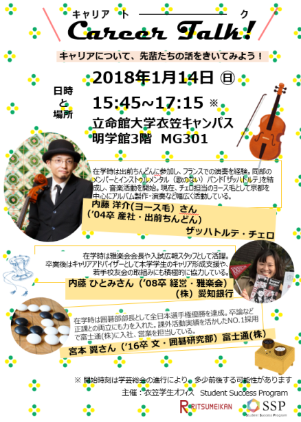 2018年1月14日(日)衣笠キャンパスにおいて、学生分野の課外自主活動に参加している学生約500名を対象に、「Career Talk」企画を開催しました。
