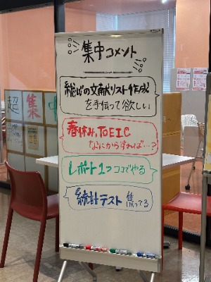 2025年1月8,10,15,17日の3・4限(13:00~16:10)、SSP OICは「超集中勉強会」を開催しました。学習面やモチベーションの悩みを抱える学生が、ピア・サポーターと共に学び合い、課題解決を目指してOICに通う学部生対象に開催された本企画には、計17名の参加がありました。