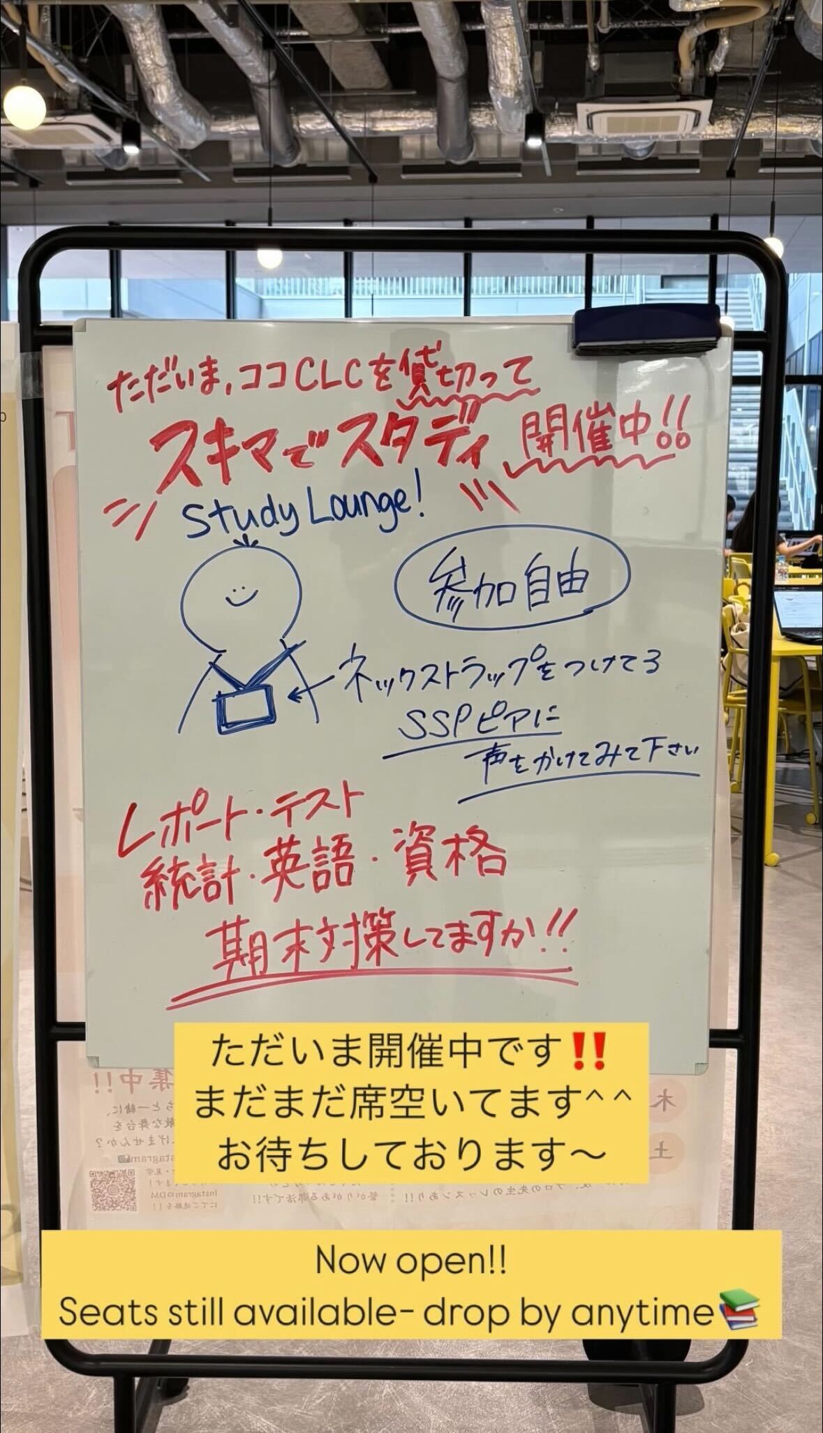 During the event planning phase, it was pointed out that last year's 'Super Intensive Study Session' had an issue: while participants could concentrate on their studies, the atmosphere was rather stiff, making it difficult for some students to participate. Therefore, this time, we prioritized creating a more casual space and held the event at the CLC on the 2nd floor of Building H, which allowed for easy come and go. Also, we tried to promote this event as much as possible to reach more students. This included posters, announcements on manaba+R, Instagram (which many first-year students had started following during the spring “Consultation Hour” event), and highly visible digital signage.