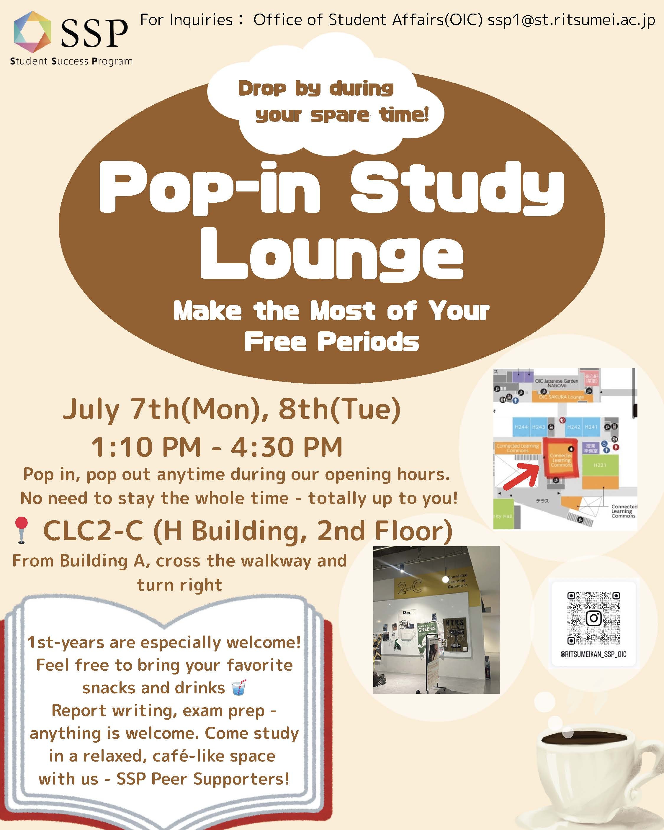 On July 7th (Mon), and 8th (Tue), SSP OIC Peer Supporters hosted an event titled “Pop-in Study Lounge: Make the Most of Your Free Periods” during the 3rd and 4th periods (13:10-16:30) at the Campus.