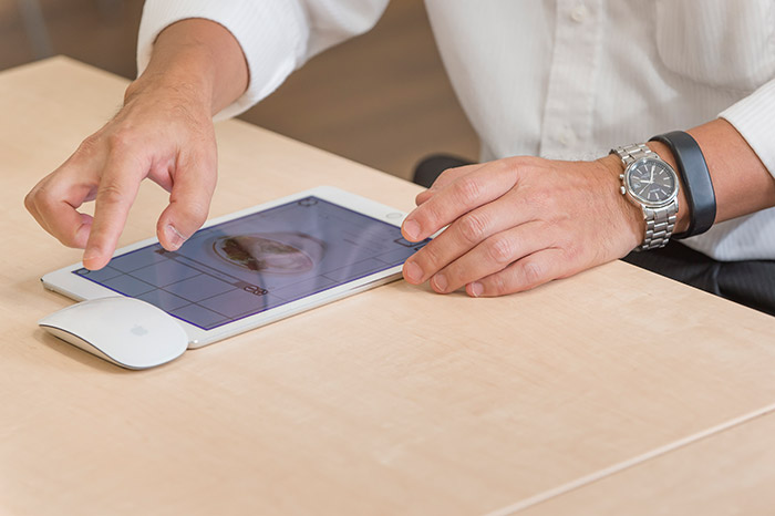 - 実はとてもシンプルです。タブレット内にスクロール可能な大きなデスクトップ画面を作り、それをネットワークを通じてみなで共有しているだけなんです。テーブル上のタブレットの動きは、タブレットの端に付けているマウスを介して、タブレット内のデスクトップ画面上の動きに連動するようになっています。つまり、本物のテーブル上のタブレットの位置が、タブレット内のデスクトップ画面上の位置と一致するようになっています。そしてこのタブレット内のデスクトップ画面の情報を、コピーしてみなで共有しているというわけです