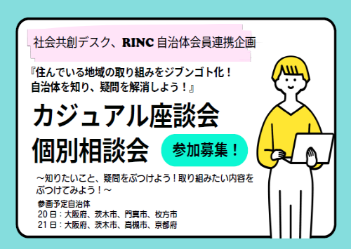 社会共創デスクおよびRINC会員である自治体とのカジュアル座談会・個別相談会を21日(金)にOICにて実施することとなりました。