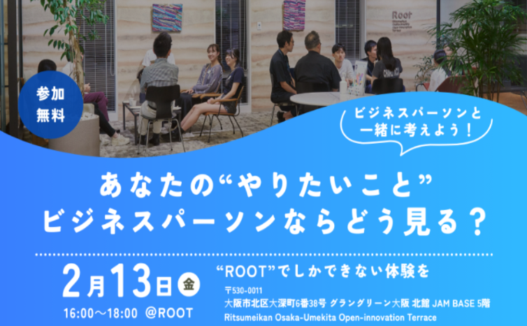EVENTS イベント情報 終了したイベントを見る イベントを探す 対象から探す 学内限定 一般参加可能 開催場所から探す TERRACE GATE SP LAB SP LAB X SEEDS Microsoft Base Ritsumeikan KOBO TRY SQUARE JIZAI HALL LIST 社会共創デスク その他 キーワードから探す #Adobe#Microsoft#QULTIVA#OIC CONNECT#RIMIX#人材育成#自己啓発支援#スキルアップ#トレンド#就活#自学自習#初心者/基礎編#365シリーズ#Power Apps#ローコード#Excel連携#アプリ作成#DX推進#ビジネスチャレンジ#学生グループ#スタートアップ#イノベーション#人脈形成#Copilot#Microsoft認定資格(MCP)#Microsoft Learn#SEEDS Member#地域社会共創#RINC#RINC MIX#共創の種#研究#探求#教養#社会課題 検索 リスト表示 カレンダー表示 12/3、1/9 学内限定 「挑戦してみたい」学生をSEEDS Member として募集中 スキルアップ 就活 学生グループ イノベーション 人脈形成 SEEDS Member 開催日による SEEDS 01/07、08、09、19、20、21 学内限定 【IT資格を無料でGET!】MSBase伴走型 いつでもどこでもMCP資格チャレンジ!ミニ説明会 スキルアップ 自学自習 Microsoft認定資格(MCP) Microsoft Learn 詳細をご確認ください Microsoft Base Ritsumeikan 1/15 (木) 13:10-14:10 一般参加可能 【アーカイブ配信】業務で活かすMicrosoft 365 Copilot入門 Microsoft トレンド DX推進 Copilot 13:10-14:10 Microsoft Base Ritsumeikan 1/16 (金) 13:00-14:00 一般参加可能 【学校法人立命館 教職員様向け】脱Accessで業務改善とセキュリティ向上を実現しよう!~Power Platformで変わる業務アプリの未来~ Microsoft トレンド 初心者/基礎編 ローコード DX推進 13:00-14:00 Microsoft Base Ritsumeikan 1/24(土) 12:50-16:40 一般参加可能 【オール立命館&保護者・一般対象】小中高大の学生・生徒・児童のための創発性人材育成講義シリーズ2026 人材育成 自己啓発支援 イノベーション 人脈形成 探求 教養 12:50-16:40 その他 2026年2月13日(金) 学内限定 立命館のオープンイノベーション施設ROOTで実施する学生×社会人イベント。 あなたの「やりたいこと」ビジネスパーソンならどう見る? 人材育成 自己啓発支援 自学自習 人脈形成 共創の種 探求 16:00~18:00 その他 もっと見る 閉じる イベント参加の申し込み 個別相談の申し込み Home EVENTS