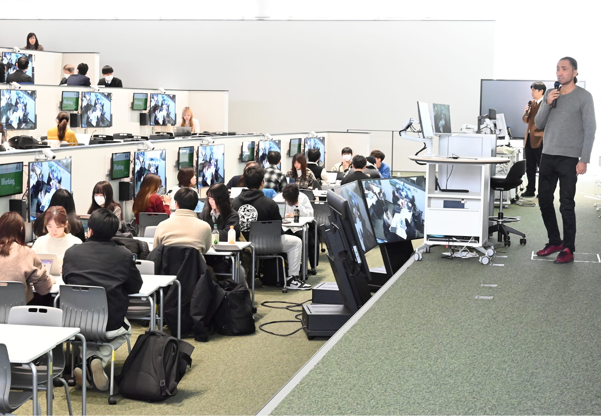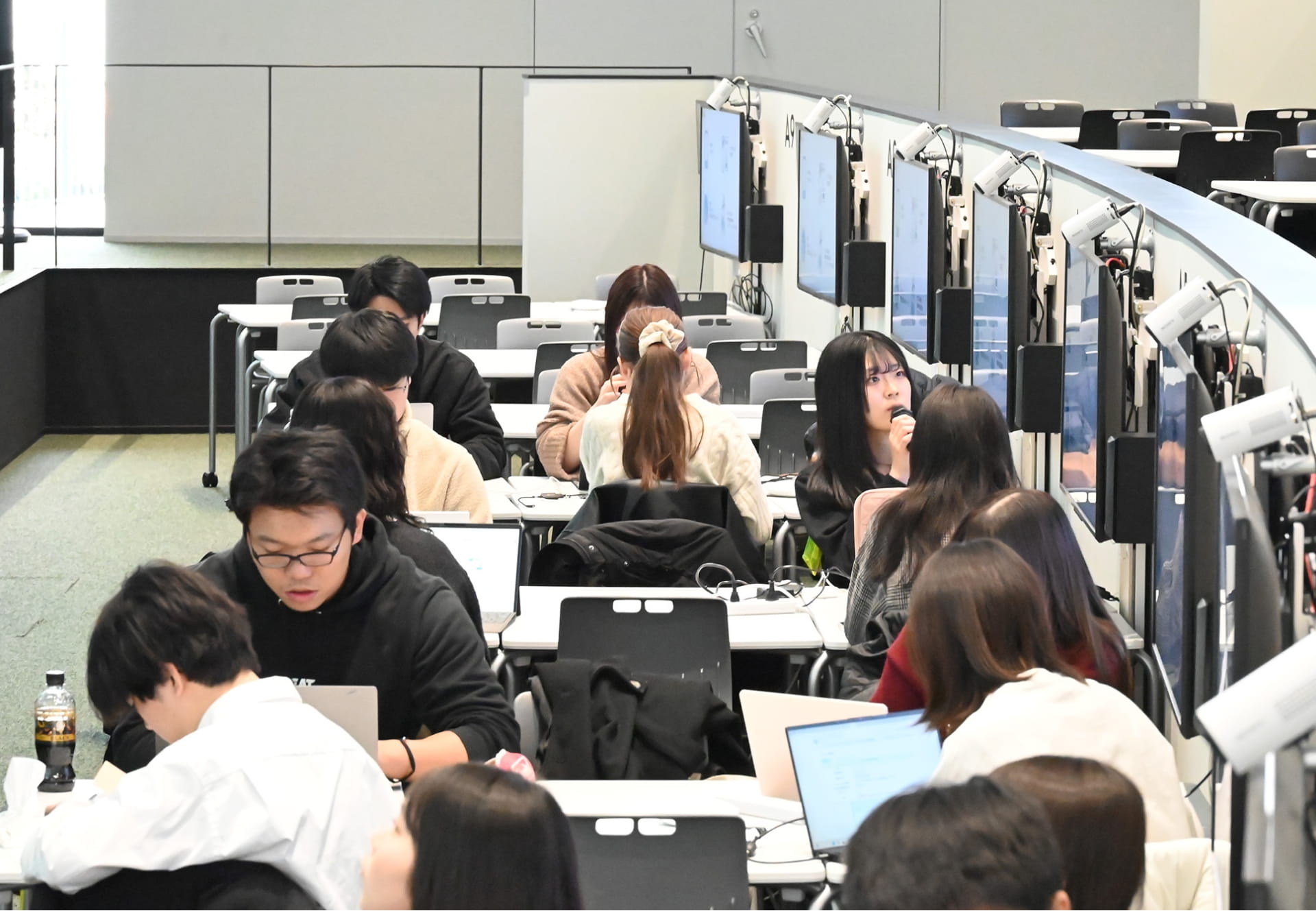 教室はOIC H棟201教室、Learning Infinity Hall。6人がけのブースそれぞれに、タッチパネルモニター、カメラ、マイク、スピーカー、パソコン接続ケーブルが設置されていて、グループごとの作業を先生が手元で把握でき、グループの作業内容や資料を学生自身の操作によって全体化したり、特定のグループだけと共有したりも可能です。
