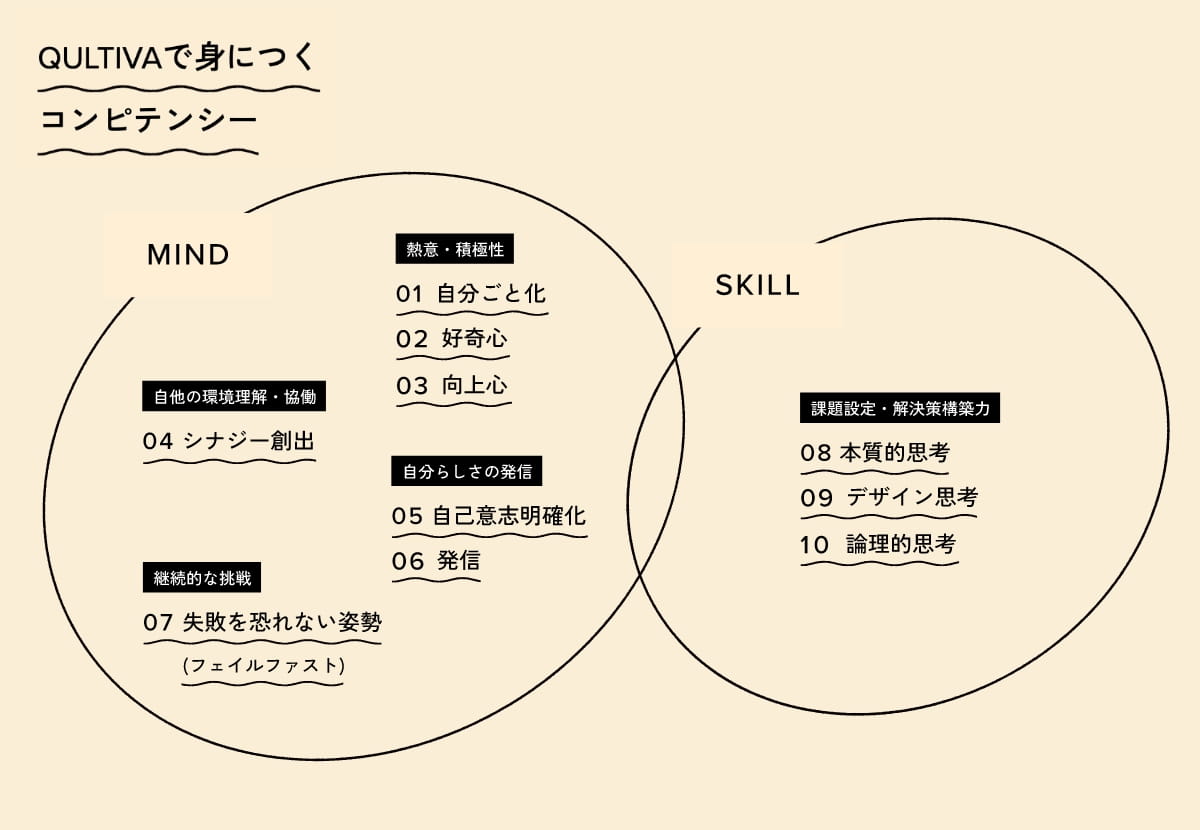 初年次教育改革では新しい評価基準の構築も論点となっており、これに関しては2024年春セメスターから課外の運用がスタートした「QULTIVA(カルティバ)」プログラムでのコンピテンシー評価が参考となりました。多角的な視点から内省・振り返りを行う「リフレクション」を基軸としたプログラムの実践を通じて、7つのマインドと3つのスキルを中心とする「コンピテンシー」の習得を支援します。こうしたQULTIVAのプログラムでの実践と知見は「これまでのようにテストで学力を測ったり、レポートを課したりするのではなく、『この科目を通じて自分がどれだけ成長したか』という新しい評価指標を試してみる目的もあり、明確なコンピテンシーマップのある『QULTIVA』プログラムを正課の科目でも取り入れてみることにしました」(横田教授)。