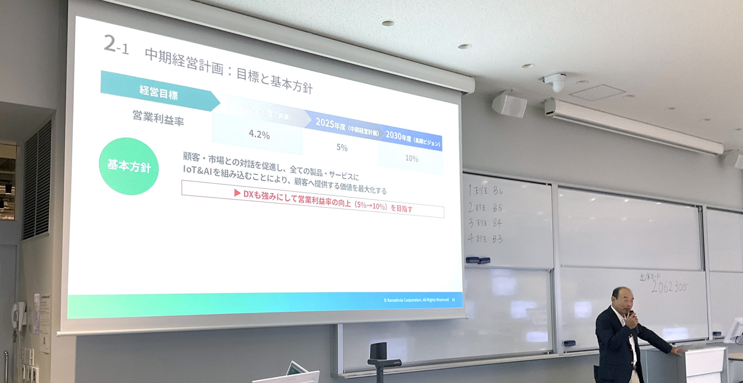 2024年度秋セメスターからは、正課の科目に取り入れる試みも始まりました。その一つが経営学部「経営学特殊講義α」。もう一つがこの教養科目E群の「教養ゼミナール(47)」です。本教養ゼミナールは、初めての試みがさまざまに盛り込まれたクラスでした。「未来創造の探究×研究」をテーマに、総長、副総長など学園のトップ研究者が「なぜ研究者を志したのか?」について語りかけ、多様な学部と回生で構成されたグループで、世界的企業であるカナデビア株式会社(旧 日立造船株式会社)から課された社会課題の解決に挑む。さらにそれらを複数の教員と職員がサポートする。およそ教養科目らしからぬ内容に履修学生の負担は大きかったかもしれません。しかし、多くの学生にとっては視野が開かれるような瞬間があったに違いありません。