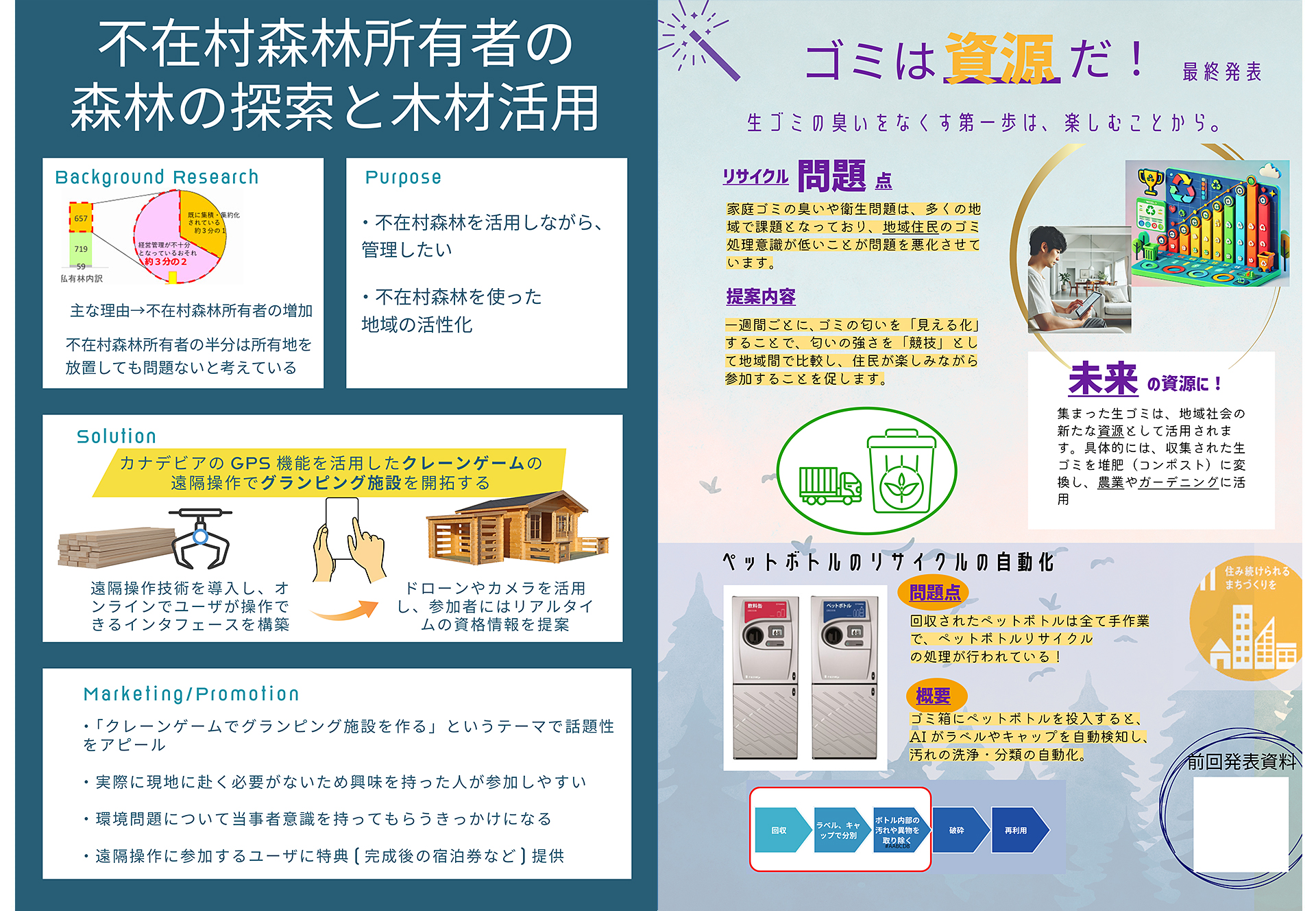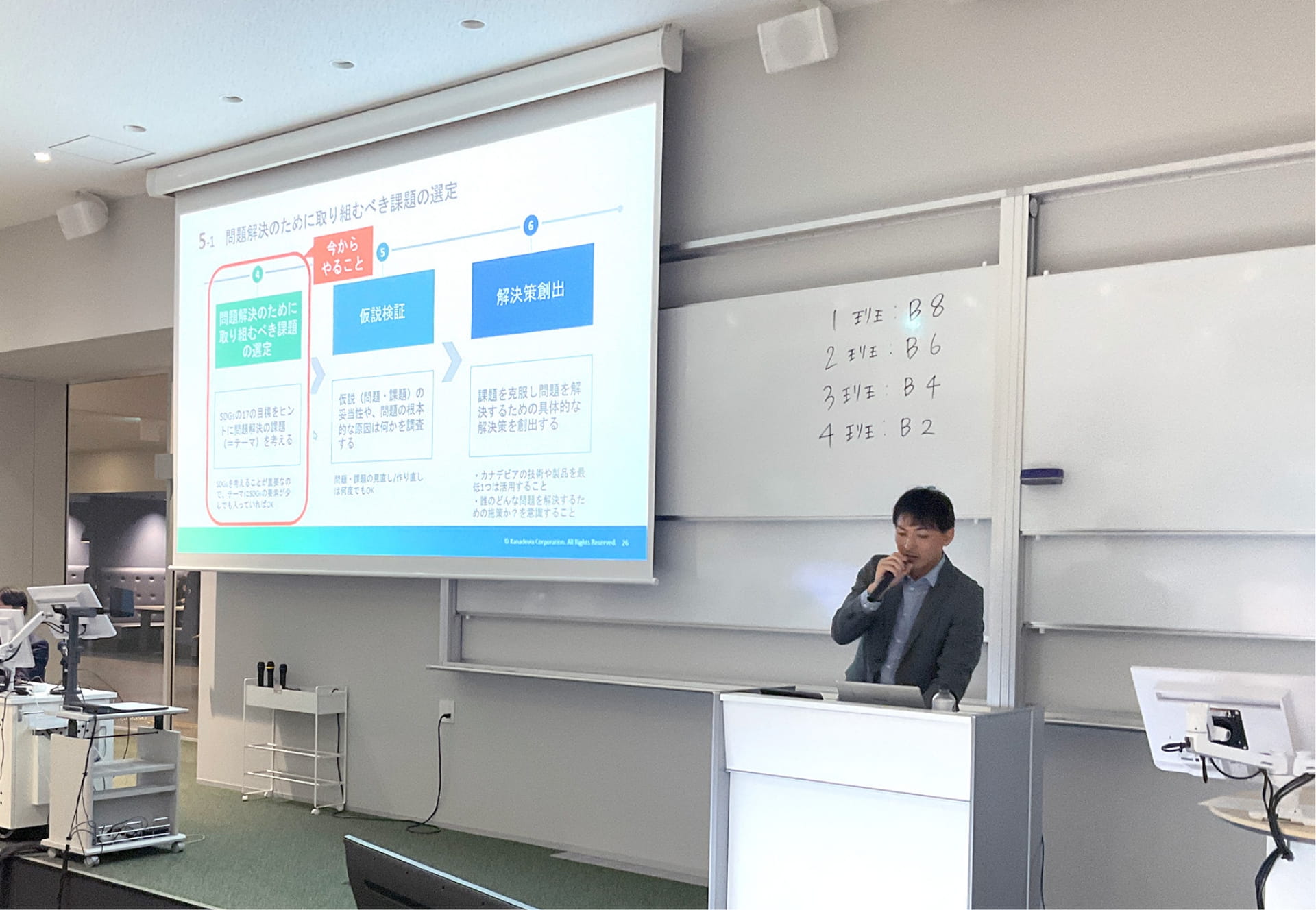 三宅雅人副学長・社会共創推進本部長による「QULTIVA」「デザイン思考」講義の後は、いよいよグループワークによる社会課題への取り組みが始まりました。テーマを提供してくださったのは、OIC H棟4階の社会共創拠点「Co-Creation Hub with Ritsumeikan」のブース(プロジェクトルーム)に入居し、すでに大学とのさまざまなプロジェクトに取り組んでいるカナデビア株式会社(旧 日立造船株式会社)です。取締役・常務執行役員の橋爪宗信氏、ICT推進本部 デジタル戦略企画室の山下智史氏のお二人が、最後まで授業に参加してくださいました。同社はごみ焼却発電施設や、造水および浄水などの水処理プラントやシステムなどを中心とした環境事業を主に展開しており、環境関連の分野で高い存在感を示しています。最初の授業で同社の沿革や事業内容の説明があり、次の回で同社が考えてほしい社会課題の大きなテーマが提示されました。その中から学生が選んだのは「地方再生」「離島や過疎地域のコンパクト/スマートシティ」「林業」「茨木市内でのごみ・水の循環」の4つです。