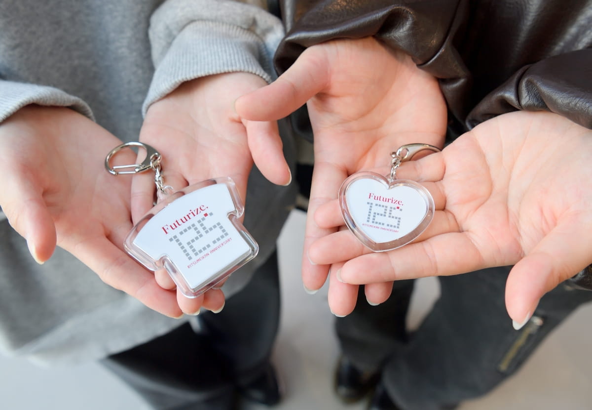 もう1つは、手持ちの画像をAdobe Expressのテンプレートで加工してプリントアウトし、オリジナルのキーホルダーをつくる「ExpressキーホルダーDIYブース」です。友達と撮った写真やペットの写真などを表面に、裏面には立命館オリジナルの画像を入れて自分だけのキーホルダーをつくっている人が多く「もう卒業なので、立命館のいい記念になりました」と喜んでいる姿が見られました。Adobe Expressを初めて使ったという学生は、「面白かったです。スマホではやりにくい部分があったので、今度パソコンで使ってみようと思います」と笑顔で話していました。