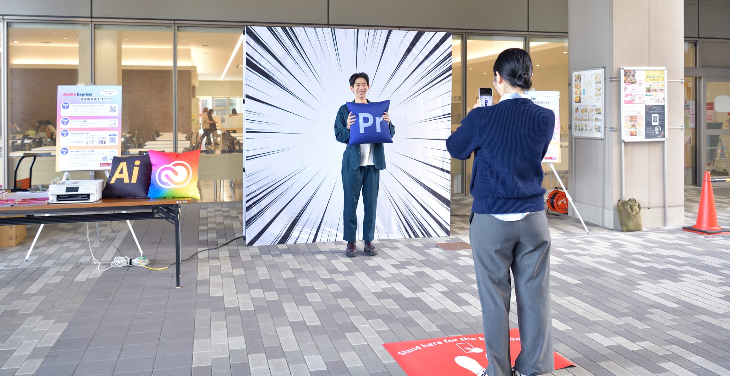 セミナーとは別に、事前申込不要で誰でも自由に参加できるポップアップイベントがH棟 OIC Cafeteria前のシンボルプロムナードやTERRACE GATEで終日開催されました。1つは「立命館特別仕様!Expressフォトブース」。設置された漫画風背景のフォトブースでスマホ撮影した写真をAdobe Expressで思い思いに加工して楽しむものです。集中線を背に撮影した写真はそれだけでも漫画風ですが、テンプレートから「ゴゴゴ」「パチパチ」などのテキスト素材を選択してレイアウトすることによってさらに漫画らしくなり、楽しさも倍増します。授業の合間に立ち寄った学生や教職員がAdobe Student Ambassadorに説明を受け、楽しそうにグループで撮影し、わいわいと話しながら加工している様子が多く見られました。外国人留学生が漫画風の画像制作を積極的に楽しんでいる姿も印象的でした。