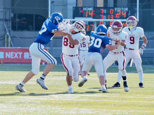 後半のKGのキックオフはオンサイドを決められ、フィールド中央で攻撃権を奪われる。立命館宇治ディフェンスは流れを持って行かせじと、パントに追い込む。立命館宇治オフェンスはランプレーを繰り返し、敵陣に攻め込み、ここぞというチャンスでパスを決め、ランプレーでジリジリとゴールラインに近づき、最後は左へのパスでタッチダウン。第3Q残り3分23秒でタッチダウン。TFPは2点コンバージョンを成功させ、21-14と再びリード。その後の立命館宇治のディフェンスのビッグプレー連続で敵陣内で止め、流れを引き寄せる。ゴール前15Yからパンサーズオフェンスがスタート。KGも懸命のディフェンス。パンサーズはフィールドゴールで3点を積み上げ24-14。この後の関西学院の攻撃を止め、立命館宇治自陣35Yからの攻撃。10点差で残り7分。ランプレーで時間を使いながら、最後はタイトエンドへのパスでタッチダウン。31-14。残り3分50秒。パンサーズは、ディフェンス・オフェンスともに集中力を切らさず、時間を消費して試合を決めた。