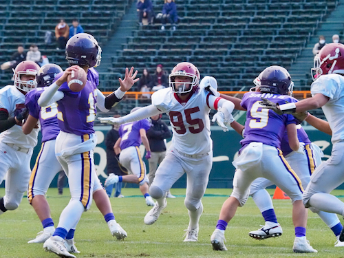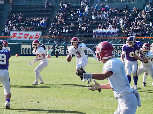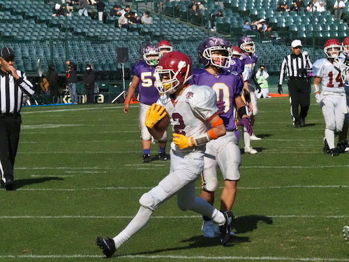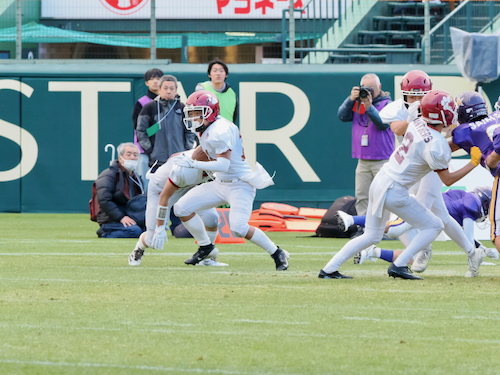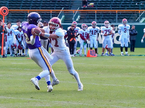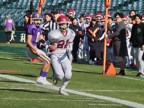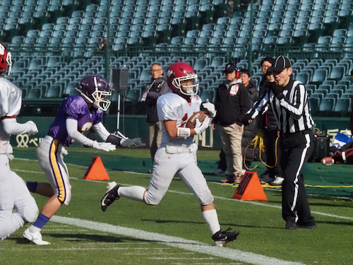 後半は立命館宇治の攻撃から開始。ファーストシリーズでパスを左右に振りながらゴール前まで進み、最後はゴールエリア隅へのパスを見事に成功させ、待望のタッチダウン。7-14と1ポゼッション差に詰め寄り、試合の行方は再び分からなくなりました。
