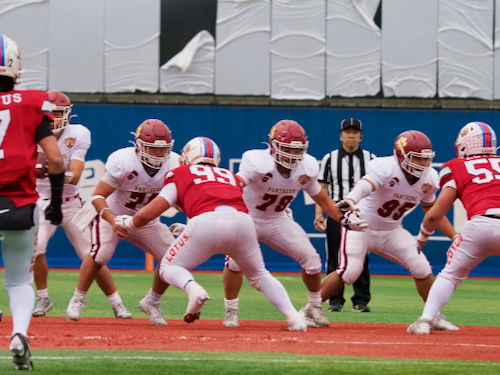 このままでは終われない佼成は、ランで自陣に踏み込まれ、さらにパス、パスで自陣深くまで攻め込まれるも、4thダウンギャンブルをしのぎ、攻撃権を取り戻しました。その後は双方が相手の攻撃をつぶし合い、時間が過ぎていきます。最後は佼成が決死のロングパスを投じるも届かず、試合終了。立命館宇治の勝利が確定しました。